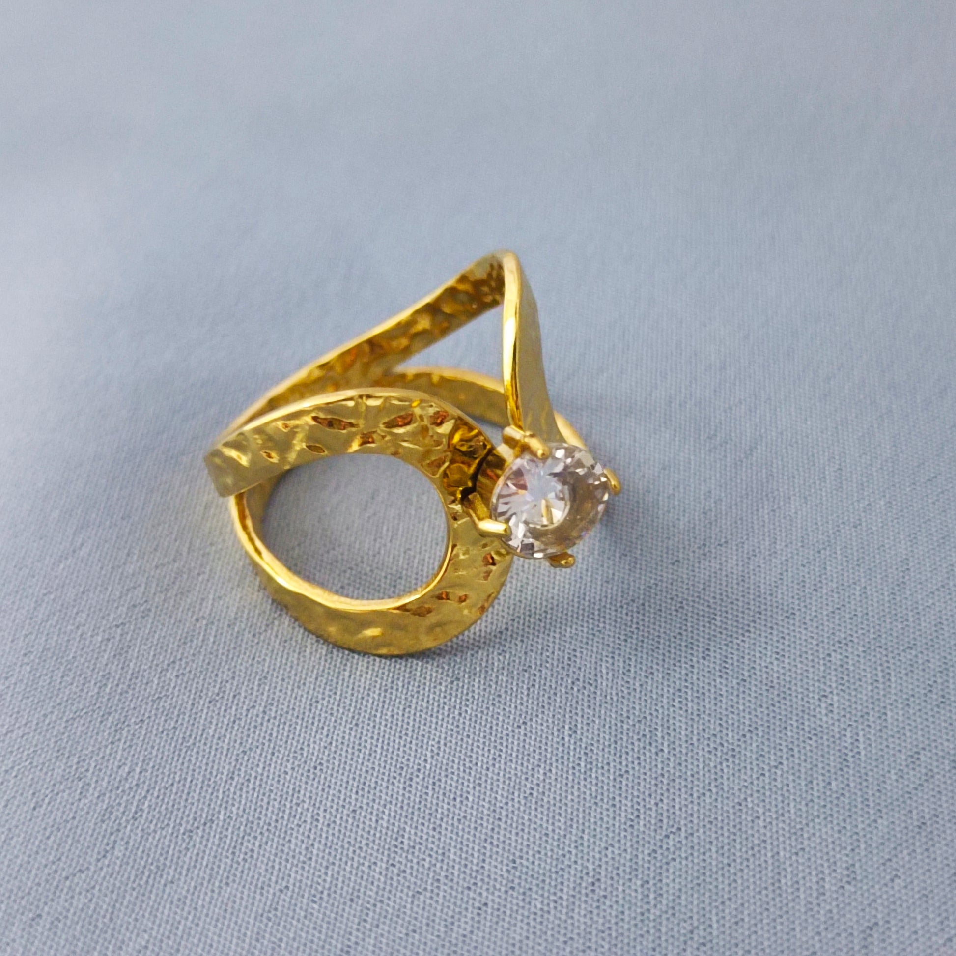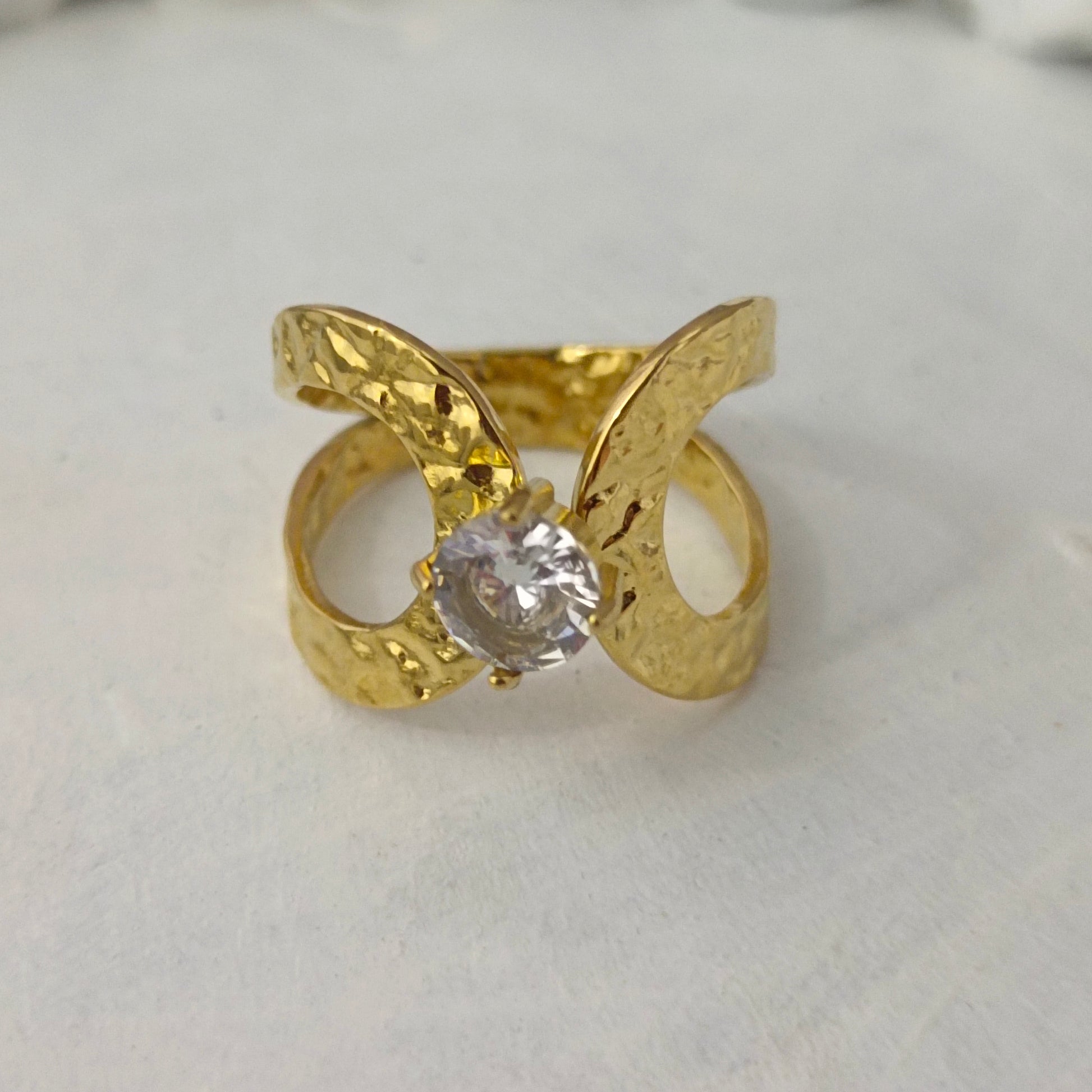 Inspired by celestial elegance, the Golden Eclipse Ring showcases a handcrafted hammered texture that catches the light beautifully. Finished in luxurious 18K gold plating, this ring delivers a rich, radiant glow with a modern minimalist edge.